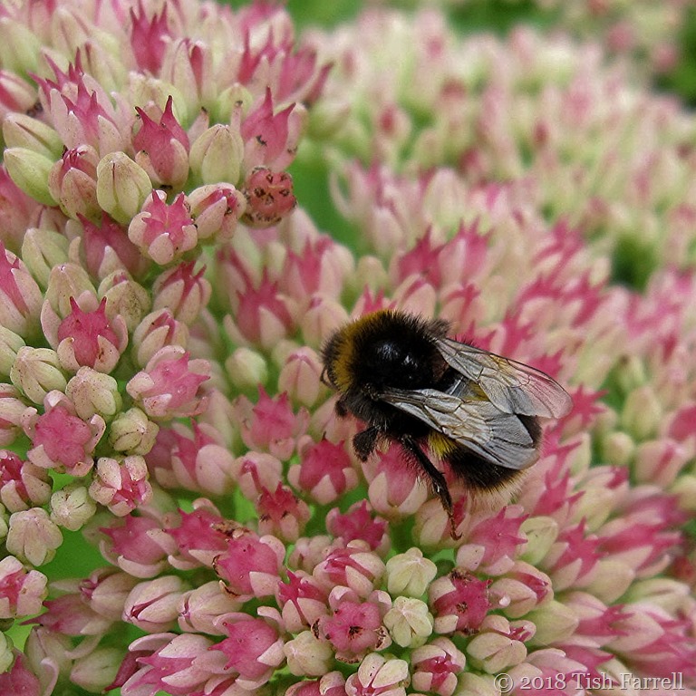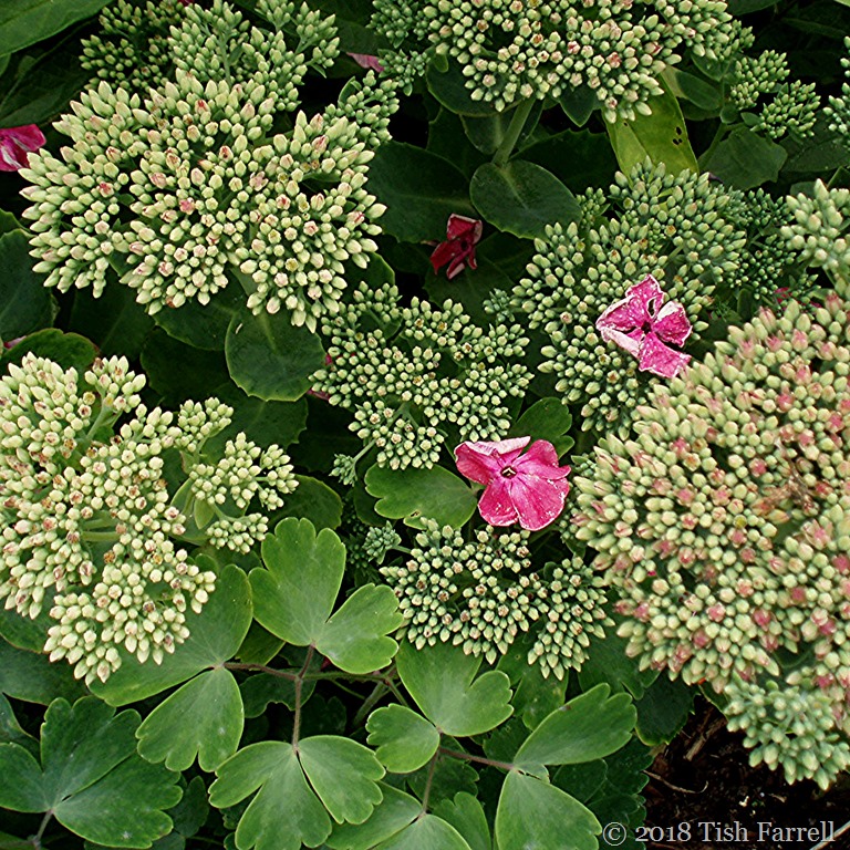 They are late summer bloomers of the stone crop family with flat umbrellas of tiny flowers, on the cusp of opening in the header photo. (The fallen petals belong to some neighbouring phlox). Once they are flowering, the bees and other pollinators will come in swarms for their end-of-season stoke-up on nectar. They are VERY IMPORTANT bee fodder.