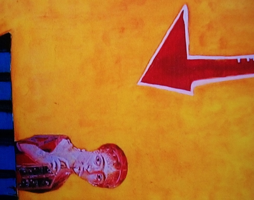 Sheilagh copied and simplified the images from a sales catalogue that specialises in heritage reproductions. The placing of the queen in the central position is also significant. She says she feels bound to redress an imbalance: the fact that in most of our media women only occupy centre stage when they are being commodified in some way. And then there is the mathematical equation painted in red beneath the red tree, centre right of the painting. 100_5291 The presence of equations in Sheilagh’s works adds a further layer meaning for her, and although she doesn’t think it necessary to explain them, she is always very pleased when people recognise them. This particular one refers to mathematical research by American academics in the 1920s called The Geometry of Paths. The appearance of equations in Sheilagh’s paintings also has more personal origins. She tells me she started to include them some years ago – after she had been helping her daughter revise for her Maths and Physics A’ level exams. It is another connection. There are many more signifiers in the work: motifs that have links and resonance with Sheilagh’s other works. The red tree above the equation is a symbol of timelessness, indicating ‘forever’ in human terms.  House of Belonging ii - Copy The red arrow in the top right creates a sense of energy and direction; a ‘look what’s here’ sign. There is the sense of a force field, drawing people to the House of Belonging. 100_5294