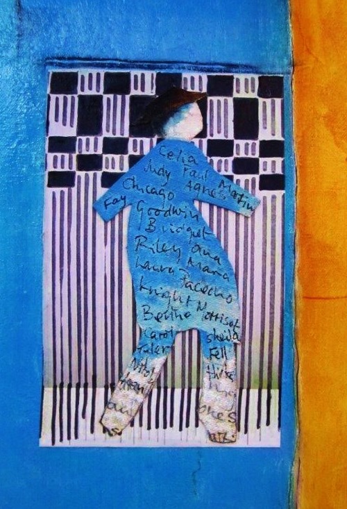 The header image is a small detail from a work called The House of Belonging. This figure has appeared in Sheilagh’s other works and represents women artists. Some of their names are written on the smock, artists perhaps not well known to the general public. Here she pays homage to their work, but also alludes to the fact that, overall, very little work by women artists is to be found in museums. The writing of names and of repeated key-words and equations is characteristic of many of Sheilagh’s pieces. It was one of the things I was going to ask her about. But first, the painting.