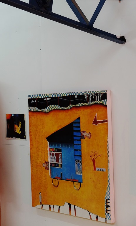 It is a large canvas, some 4 feet (120cm) square. The next photo gives a better sense of scale. Here it is hanging in Sheilagh’s studio: