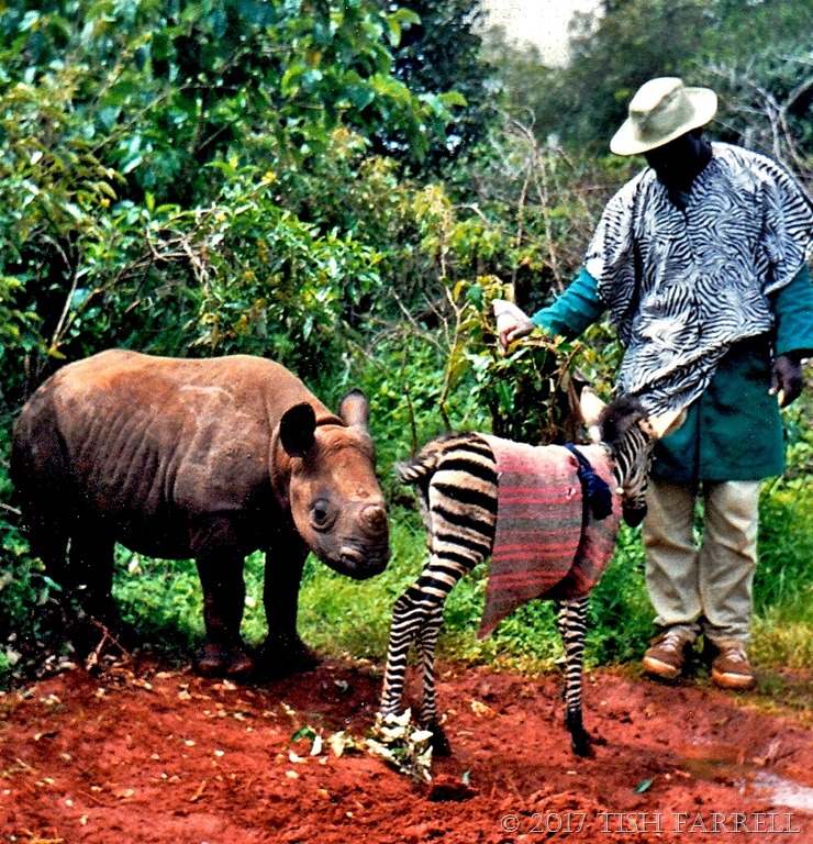 At her orphanage on the edge of Nairobi’s National Park she has developed an astonishing survival regime for all the young animals brought to her. Every orphan has its ‘mother’ i.e. one of the green-coated keepers seen in the photos. Every keeper is on full time duty with his charge, and this includes sleeping with the baby in its stall.