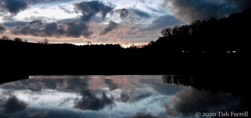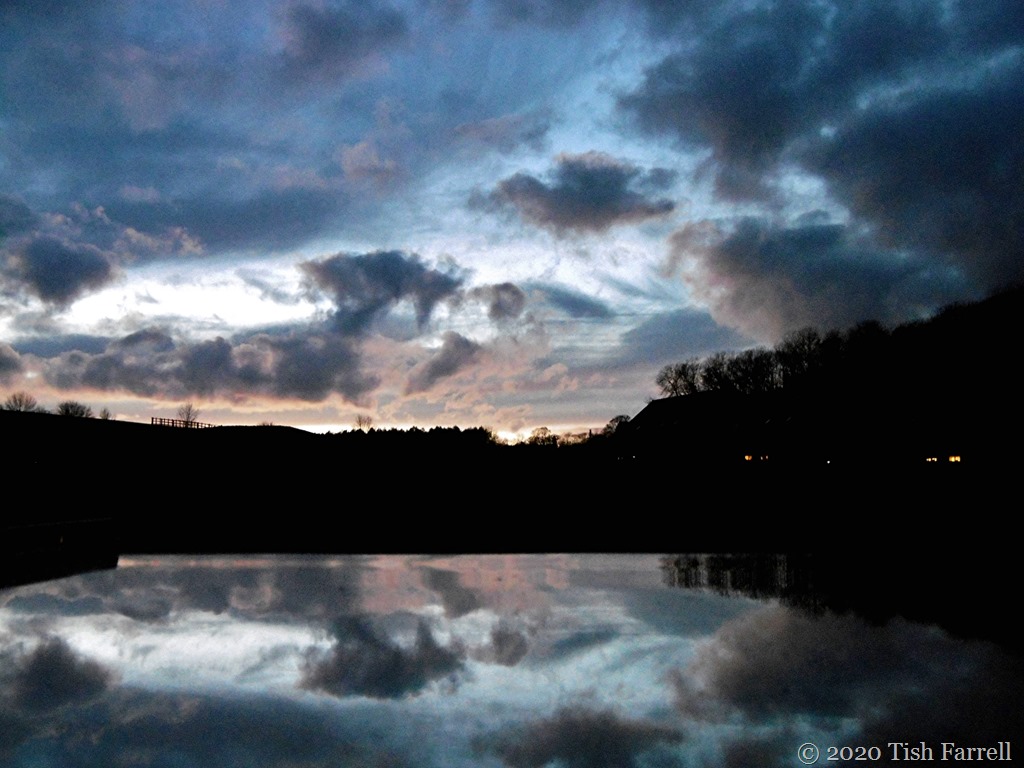 Twilight over Wenlock Edge and in my office roof-light; captured by opening the window to the horizontal and placing my little digital camera on the back of the frame. Click and there you have it – the Edge between two sky-worlds; cat’s-eye watchers looking on?