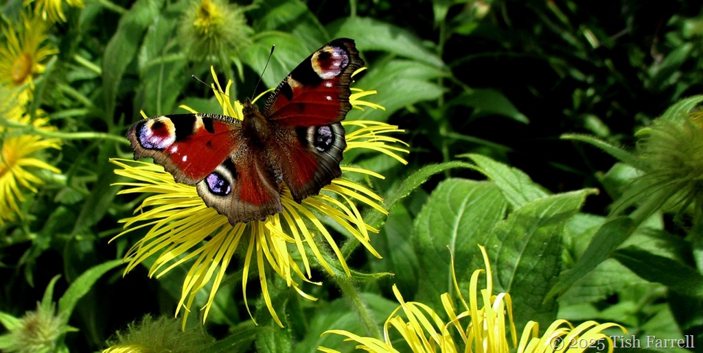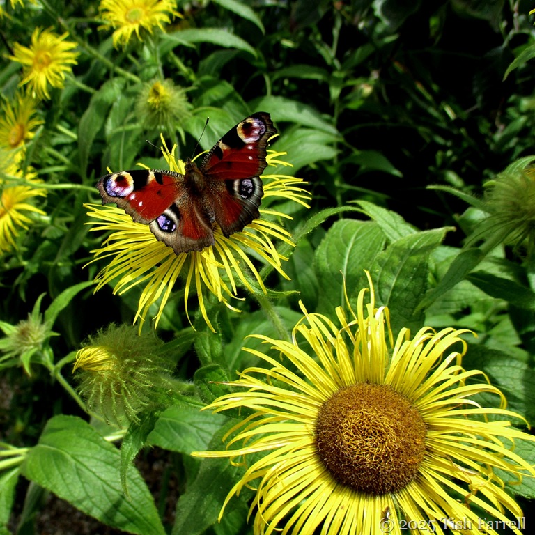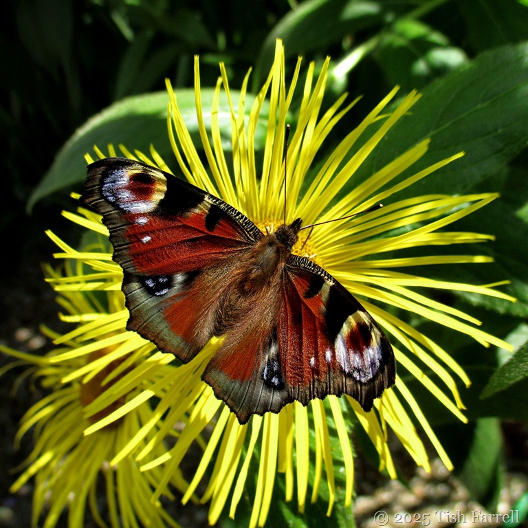 The peacock is said to be one of our commonest UK butterflies, although I’ve only seen one so far this year, and that was in our bedroom. I was more concerned with helping it escape than snapping it. These photos, then, are from our previous garden where they would often come in high summer to feed on Doronicum, aka Leopard’s Bane.