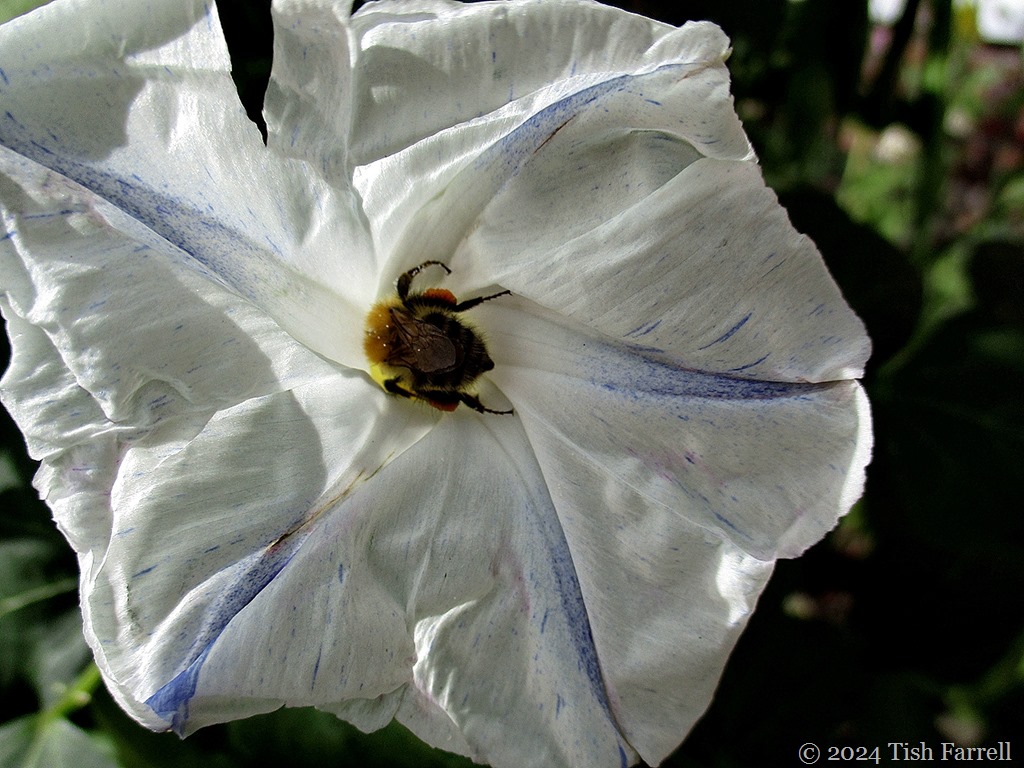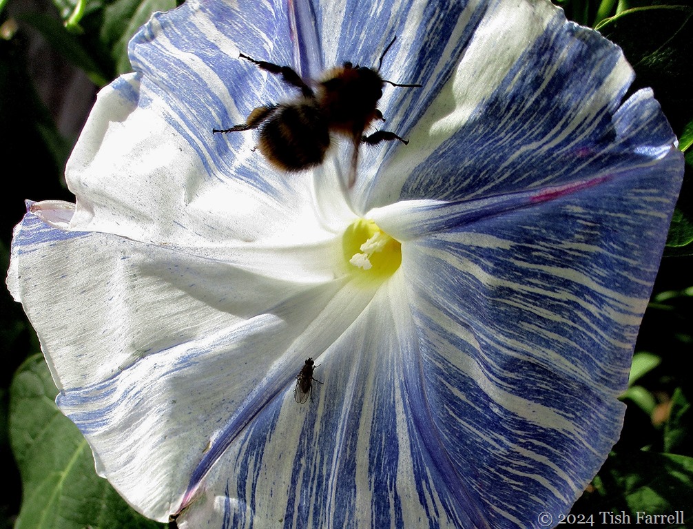 And no, we have no extra-terrestrial sightings here in Bishop’s Castle, at least not over The Gables, but I do have a few Flying Saucer Morning Glories. They are late on parade, growing up my obelisk of butter beans in the front garden.  I wasn’t really expecting them: the seed was several years old. Yet here they are, busy luring insectkind.