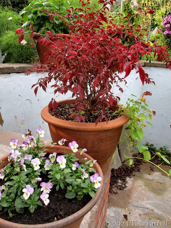 And last but not least, but definitely with an eye to autumn in its new russet foliage, this is a newcomer to the Farrell garden, Japanese cherry kojo-no-mai. (Posing here with some very sweet violas).