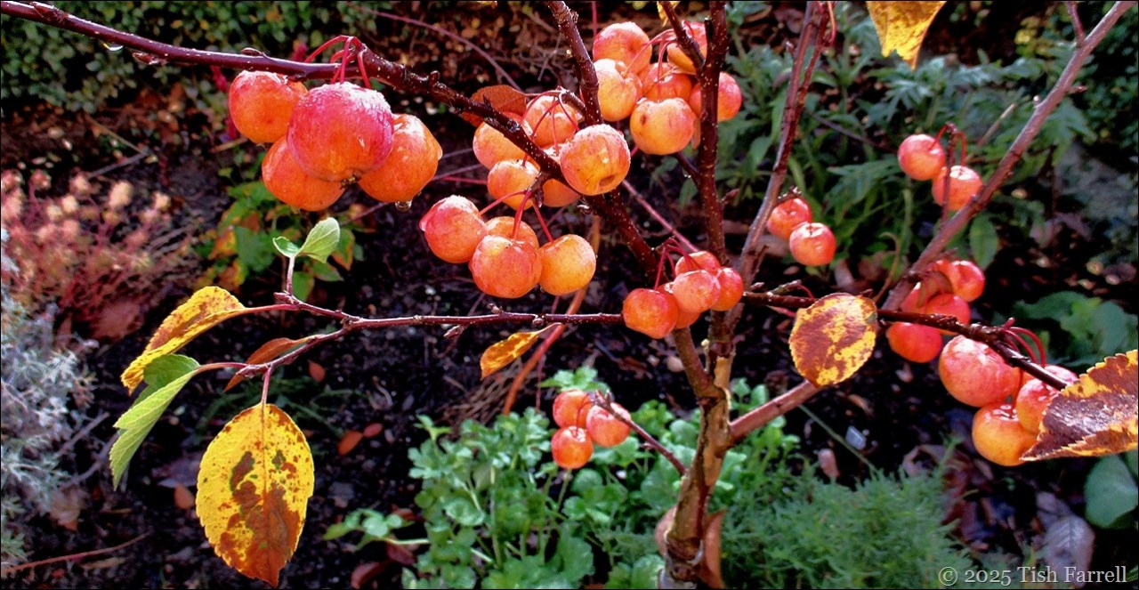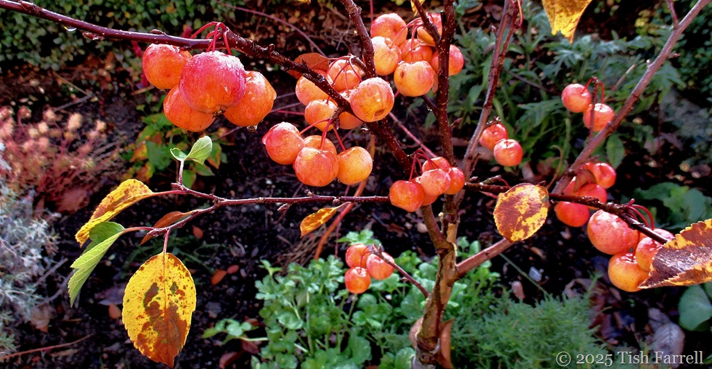 By contrast,  the crab apples are taking on a rosy glow. The little tree at the top of the garden is now much happier since we’ve had some rain and cooler temperatures. The many weeks of drought certainly stressed it: