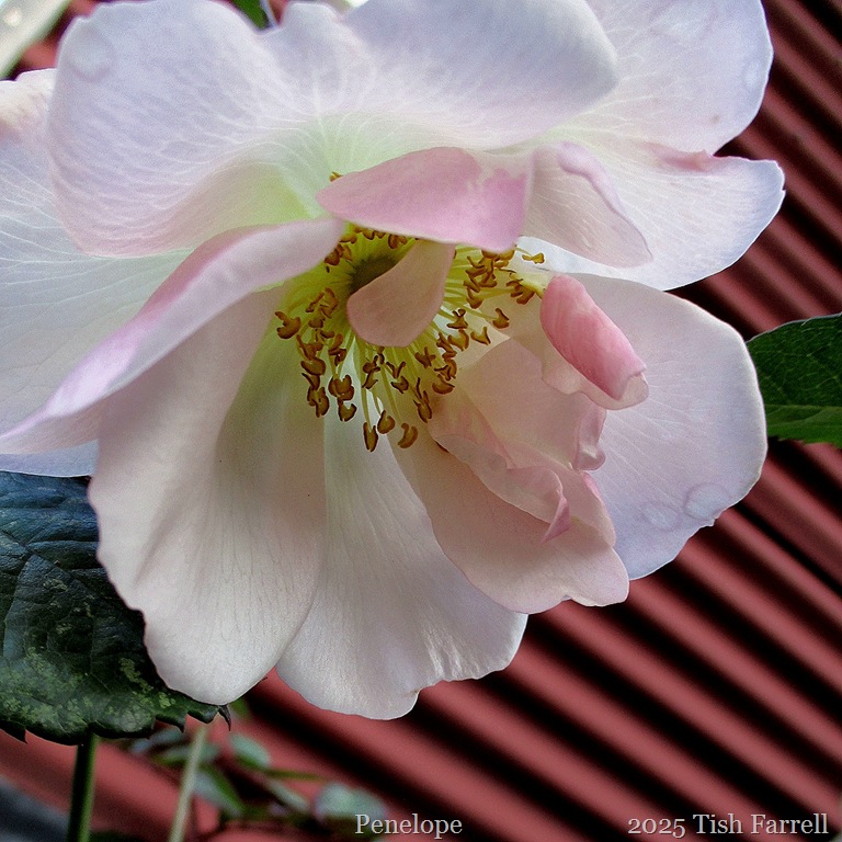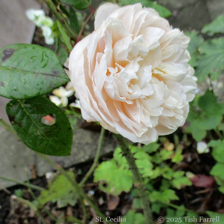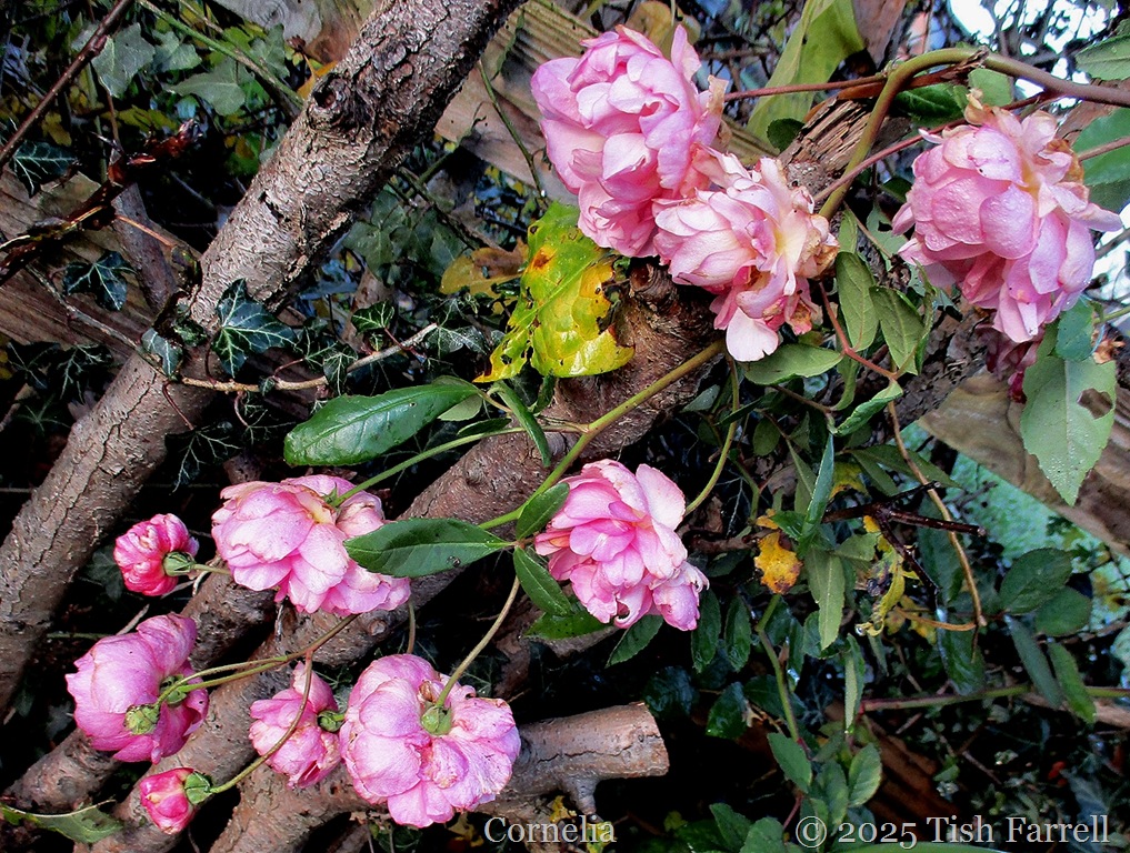 1) The rose trio, though, is hanging on, still doing their bit. Cornelia by the greenhouse is looking a little rain battered, but still very pretty. St. Cecilia on the terrace wall has been flowering sporadically for some weeks. But her neighbour, Penelope, has only started flowering this week, beautiful, but unexpected…IMG_9404