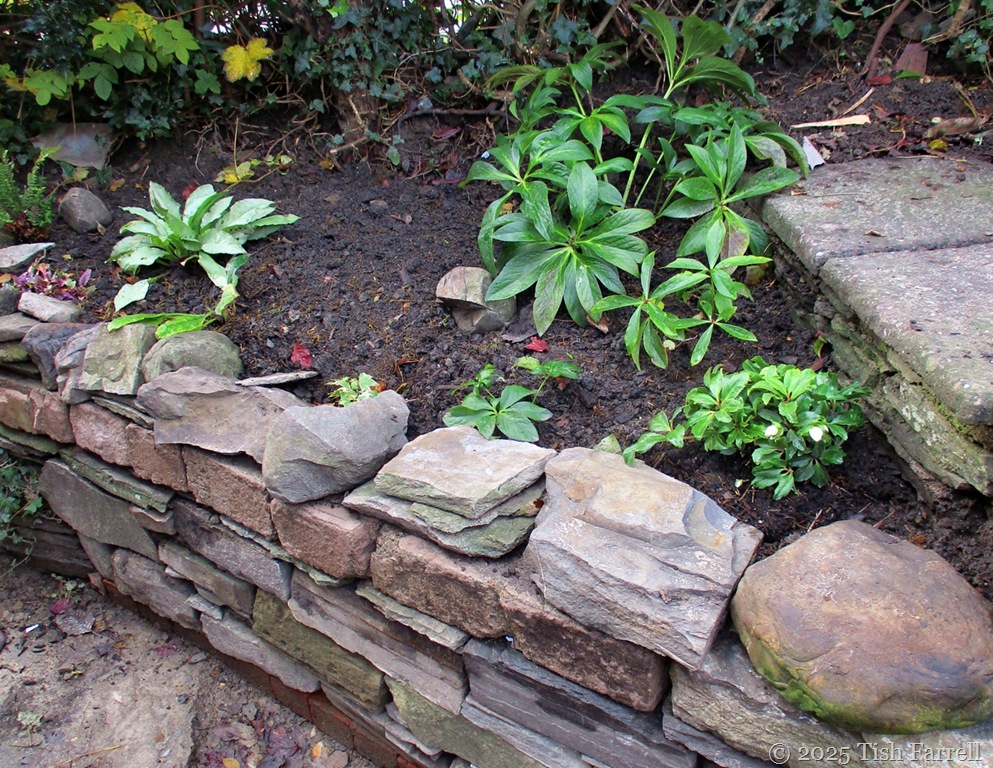 5) In between torrential rain and misty drizzle, garden tidying, and the usual plant shifting has begun. Our builder and son also came and removed an annoying (literally) stumbling block outside the back door. Last year we had the garden steps reconfigured, but the job wasn’t quite finished and the old bottom steps survived the exercise, were a real eye-sore and general all-round nuisance. But now transformation. They have been demolished and a brand new, semi-shade bed created. I’ve planted it up with assorted hellebores, (Christmas Carol in the right hand corner just in bud), dwarf daffodils, snowdrops under the hedge, pulmonaria Blue Ensign and Diana Clare (silvery leaves), and in the far left, a neat fern, Polystichum setiferum congestum. As the leaves go from the hedge end behind the house, it will get more light. A spring garden then.