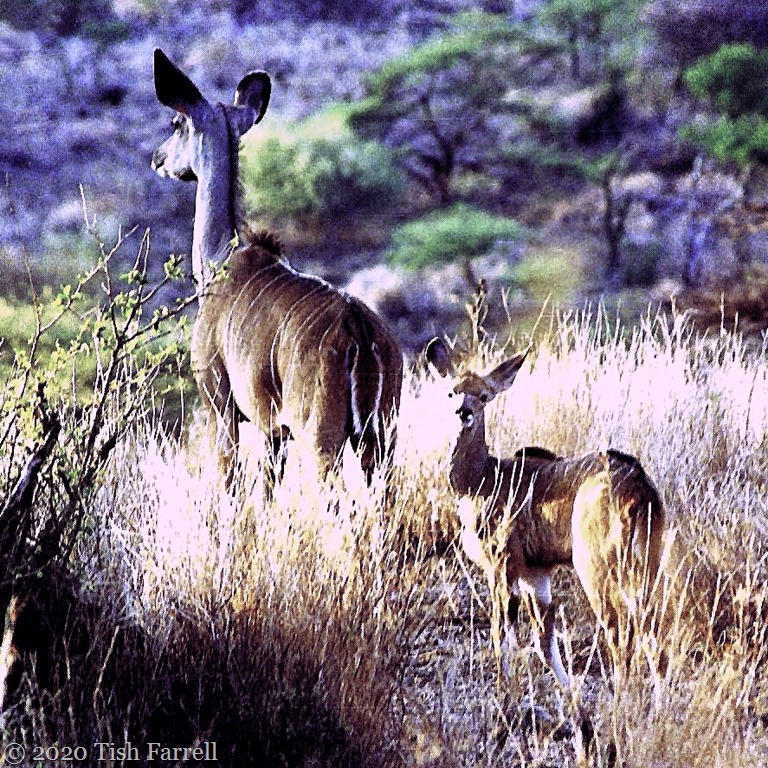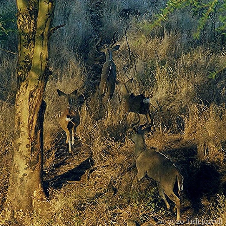 This sunset view of retreating greater kudu was taken at Lewa Downs, a private nature conservancy on the northern foothills of Mount Kenya near Isiolo. The reserve is 62,000 acres, and was once a colonial cattle ranch. The descendants of the original settler family still own the land, but now their focus is on wildlife conservation, upscale tourism, improving the lot of local communities and helping to protect surviving members of Kenya’s black rhino population.