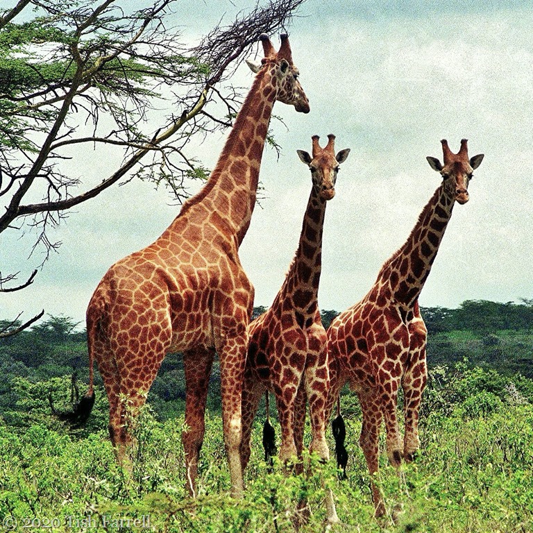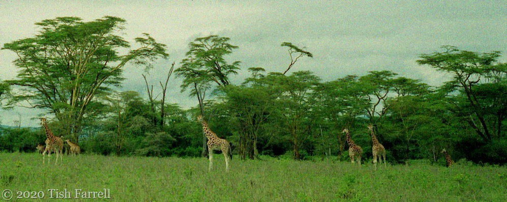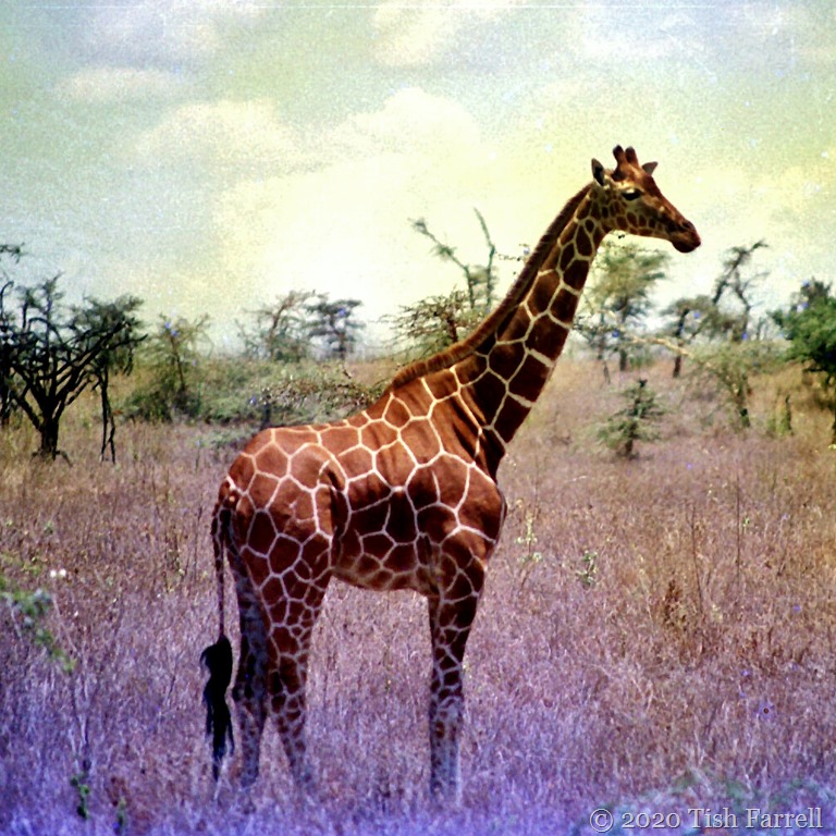 A reticulated giraffe, one of the three main giraffe races in Kenya. It is mostly found in the northern districts. This photo’s for Brian at Equinoxio. (The weird colour flashes are due to poor film processing at the time).