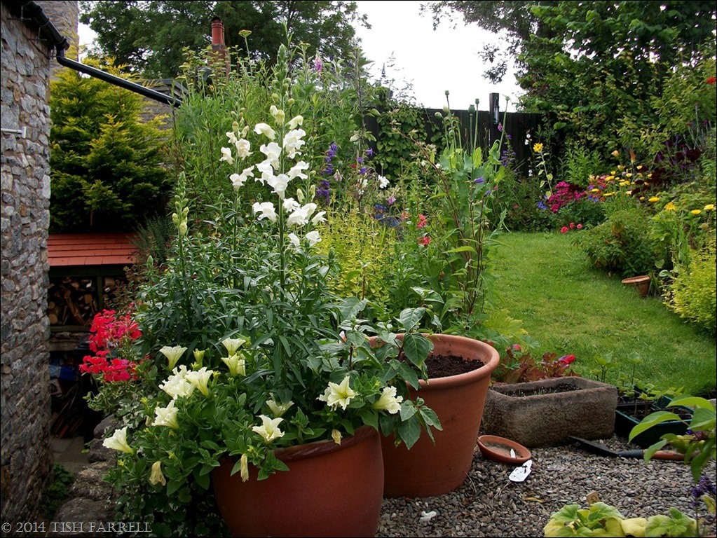 There’s a rainstorm brewing along Wenlock Edge, and the garden has taken on an autumnal air. All afternoon I’ve been watching this harvester ply the wheat field. At close quarters the cutting blades are of a scale more suited to the Canadian prairies than to a small Shropshire field. I feel the soil compact beneath the giant machinery, and it strikes me that industrial farming does not care much for the welfare of the earth, or ultimately for the nutritional quality of the crops produced.  I have this image of starvation in the face of plenty, and think how skewed have our rich-world values have become. But before I make everyone feel too dreary, here’s a brighter shot of my garden earlier in the summer.