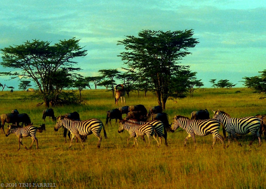 Night comes swiftly at the equator, usually at 6 to 6.30 pm. But around 5 pm there is that perfect moment when the light is like molten honey.  This shot was only a quick snap, taken after a game drive, and as we were heading back to camp on the Mara River. Our driver-guide was intent on one last go at spotting a leopard. For our part, we were simply entranced by this scene. Even at the time it seemed as if we had stepped into an oil painting. Besides, this was the most game we’d seen in one place all afternoon. Because that is something that wild life films tend not to show you: that you can drive for hours across the African bush and not see a single animal.