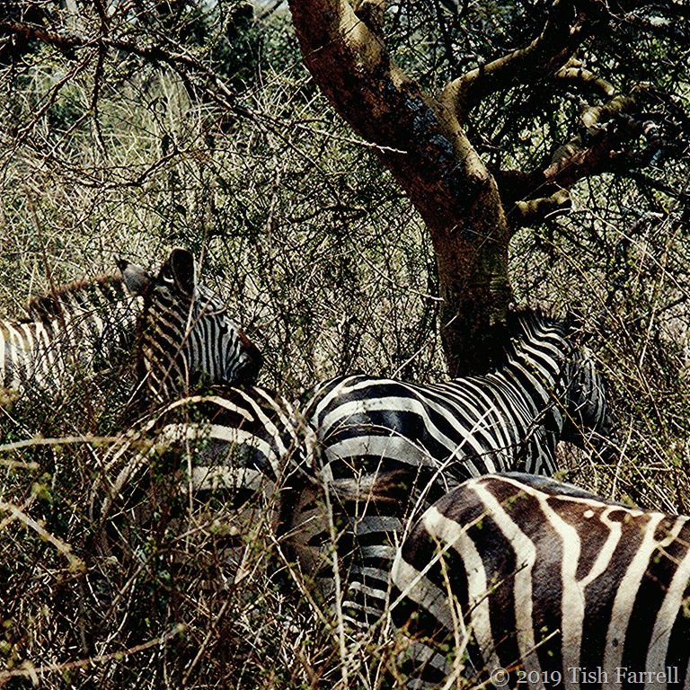 We were giving up on the quest when a park truck pulled up in front of our land rover. I thought the ranger wanted to check our tickets, but he only wanted a chat. When he discovered that we hadn’t seen the lions, he told us to follow him, and zoomed off track and into the bush. We trundled behind. Soon he had us lined up by a thorn bush. There, beside my car door was a slumbering lioness. She opened her eyes to check me out and then went back to sleep. (Lions sleep around 23 hours a day). The ranger then pressed on to the next bush, and there were the two males. I leaned out of the car window and simply took the photograph – just like that. It’s still hard to believe. I think I was there.