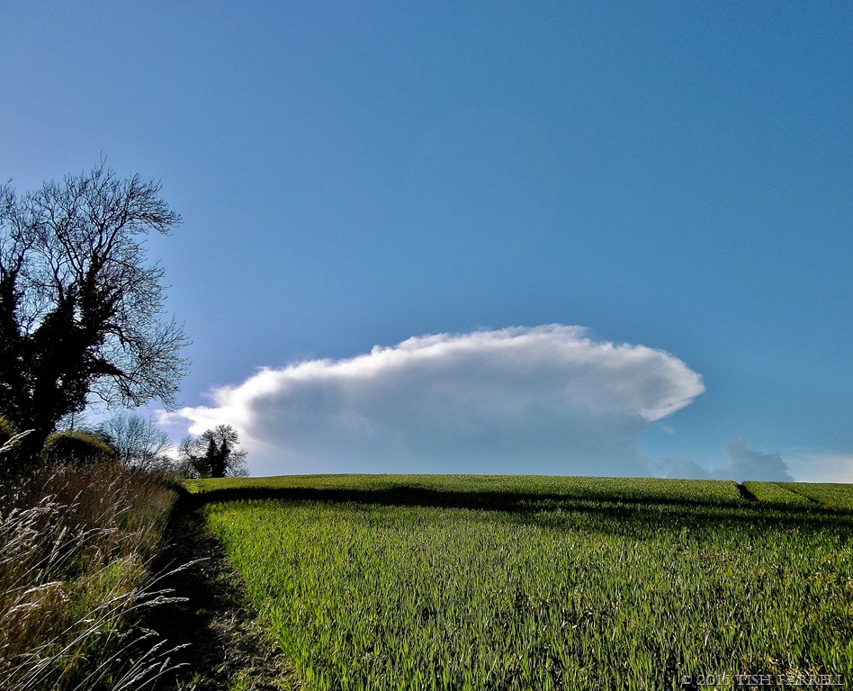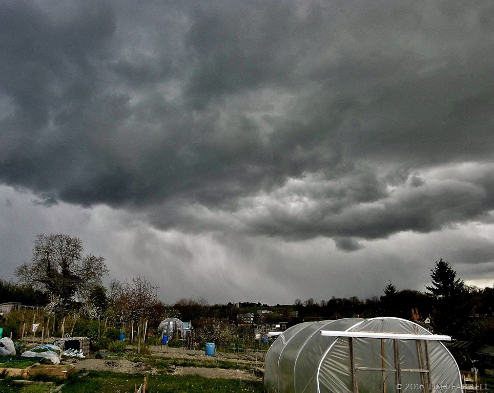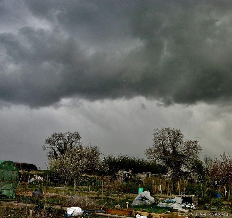 By which time it was too late, and the ground too wet to go back to compost spreading.  As I walked home across the allotment, I watched strange, but less threatening clouds gather over the hills: