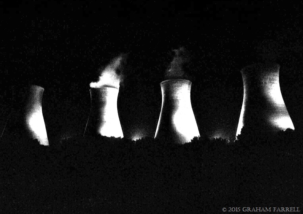 But back to those cooling towers. I am rather fascinated by them; as indeed was TV historian Dr. David Starkey, when I was showing him around the Severn Warehouse many moons ago. He was doing some consultancy for me at the time, and when I told him that in 1979, the Iron Bridge bicentenary year, the cooling towers had been lit up at night, he grew very animated, and said it was a pity that this was not a permanent feature. He felt that the power station provided a dramatic analogy of industrial prowess that would help visitors to the Gorge to grasp a sense of the importance of past technological innovation. Some people will of course hate them as ‘blots on the landscape’. But anyway, see what you think. Here’s a shot that Graham took during their nightly illumination in 1979: