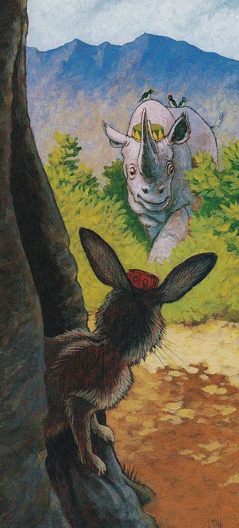 “Oh it’s you!” said Hare. “How can a fellow sleep with all your racket?” The rhinoceros squinted down at him short-sightedly.